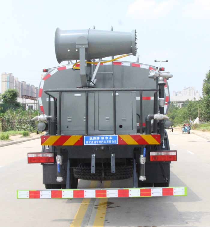 該車主要用于城鄉園林綠化噴灑作業;主要裝置為水罐及噴灑裝置;罐體總容量:10.7立方米;罐體有效容積:10.2立方米;罐體外形尺寸(長×長軸×短軸)(mm):4800×2300×1300.ABS系統生產廠家,型號:焦作博瑞克控制技術有限公司,J ABS;襄陽東風隆誠機械有限責任公司,ABS/ASR-24V-4S/4M.側、后防護材料均為:Q235碳鋼,連接方式均為:螺栓連接,后部防護截面尺寸(mm):120×50,后部防護離地高度(mm):480.隨底盤選裝限速裝置,限速89km/h.隨底盤選裝燃油箱,電瓶,尿素罐,儲氣筒左右安裝位置,選裝噴霧裝置樣式.選裝箭頭燈裝置,選裝前部電子水炮裝置樣式,選裝前部不帶電子水炮;當前部帶電子水炮時,前伸500mm,整車長度為9100mm,8550mm;當前部不帶電子水炮時,前伸為0mm,整車長度為8600mm,8050mm.選裝罐體頂部高位花灑裝置及方形罐口,選裝尾部自流口裝置,選裝工具箱.采用底盤4500mm軸距改裝.后軸僅采用鋼板彈簧懸架.