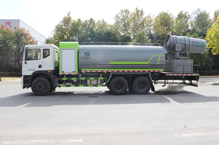 東風17方大型霧炮灑水車簡述 抑塵車又稱為綠化噴灑車、多功能灑水車、園林綠化灑水車。抑 塵車適合于各種路面沖洗,樹木、綠化帶、草坪綠化,道路、廠礦企業 施工建設,高空建筑沖洗。抑塵也可以作為運水車使用,最常見的車 型有綠化噴灑車、多功能灑水車、綠化灑水車幾大類。 我公司產品標配前噴(鴨嘴)、后沖、后灑、側噴、后置式工作 平臺,平臺上配置綠化水炮(可 360°旋轉,既可以調成柱狀,也可 以調成霧狀,更可以調成直沖狀、大雨、中雨、小雨、毛毛雨),配 備優質大功率專用灑水泵(可自吸自排,可從河里或池塘抽水到罐體), 取力器,雜物過濾網,消防接口,自流球閥系統、取力器、球閥、濾網 均為國家標準產品,主管道加粗,法蘭墊、法蘭盤加厚,大通徑球閥。 整體具備性能優良安全可靠、效率高、流量大、維修方便等特點。