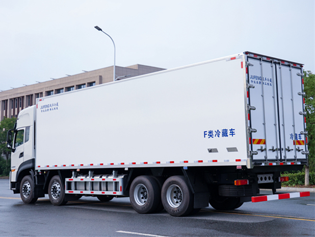 東風天龍9米6冷藏車廂體配置為:斷橋隔溫工藝,整體結構框架,內外面料為3mm新款啞光玻璃鋼夾保溫層真空復合而成,廂體厚度為8cm,最新款鋁合金包邊型材,型材局部厚度為4mm(鋼制鉚釘加固),廂體內部采用2個LED照明燈及廂體示寬燈,后門框不銹鋼材質,門框密封條為三元乙丙橡膠材質,加厚型不銹鋼合頁及鎖件;副梁為Q700車用大梁鋼,15mm厚大梁墊皮,加裝防撞膠塊,不銹鋼門鎖件,配后雙開門,副駕駛一側居中靠前開單側門一個,帶2個排水孔。