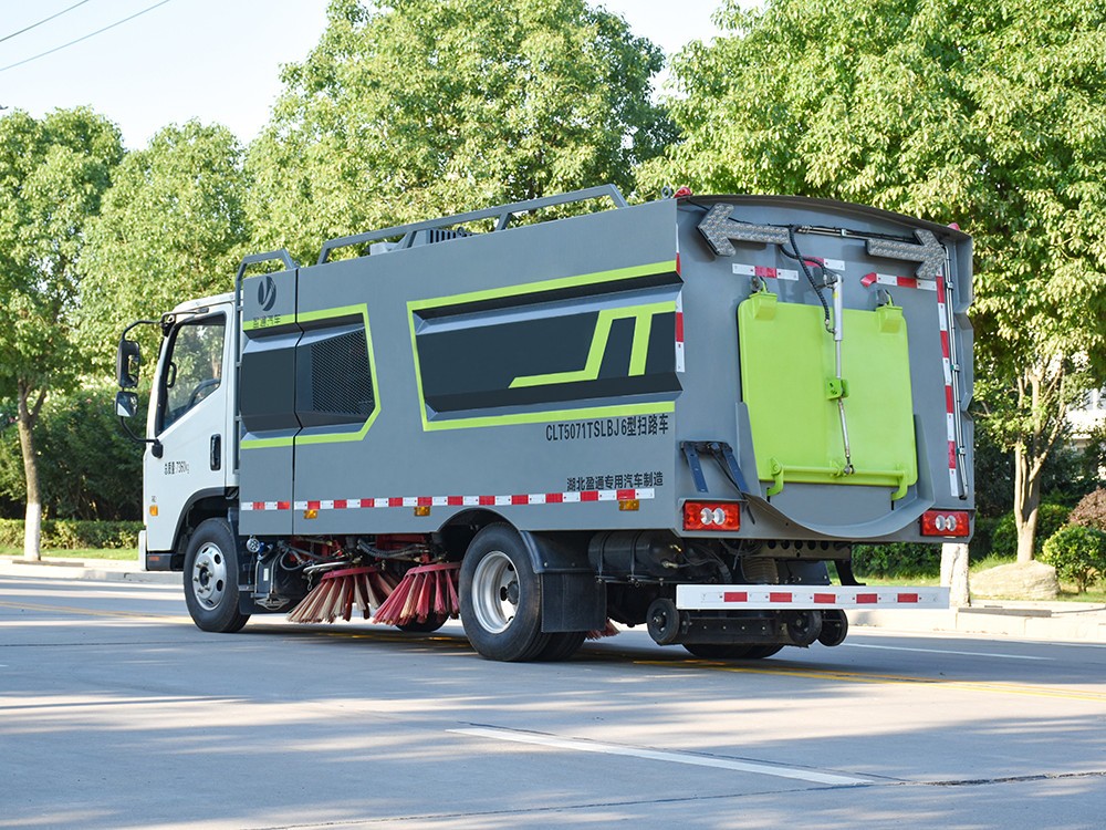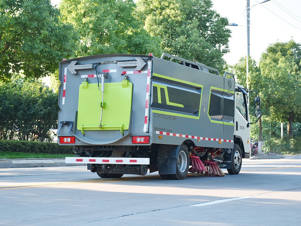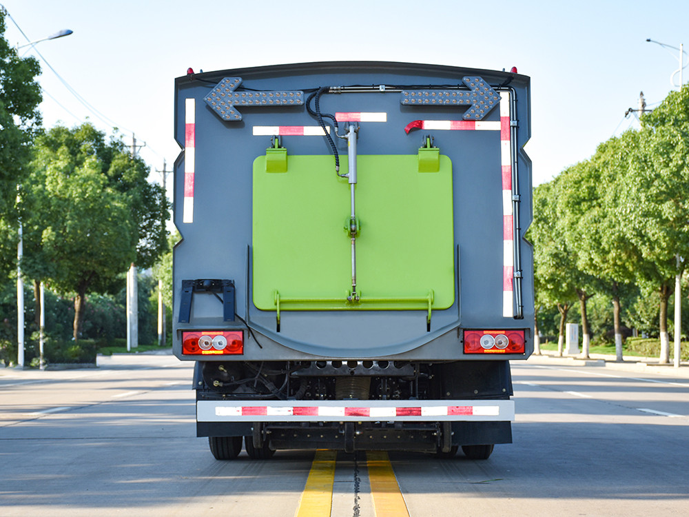 2、掃路車掃盤遇到障礙物后自動回縮,該功能有效地解決了清掃裝置易碰損的 問題。全浮動吸嘴,并可選裝帶臥吸嘴,具有清掃寬度大,清掃效率高的特點, 并有利于清掃裝置與吸嘴的調整和維護。垃圾箱內膽采用雙層結構,內層為 全不銹鋼。車箱尾部加裝箭頭警示燈,設置了手動泵應急系統,在副發動機停 機的狀態下也能收放、舉升垃圾箱,便于維修保養。主、副發動機共用柴油 箱,油量在汽車儀表板中顯示