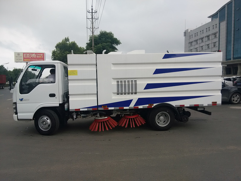 該掃路車采用重慶五十鈴型國五二類底盤改裝,加裝副發動機、風機、清水箱、垃圾箱、左右立掃、后置吸盤,掃盤降塵系統,液壓系統、專用裝置電控系統和副車架等改裝而成。