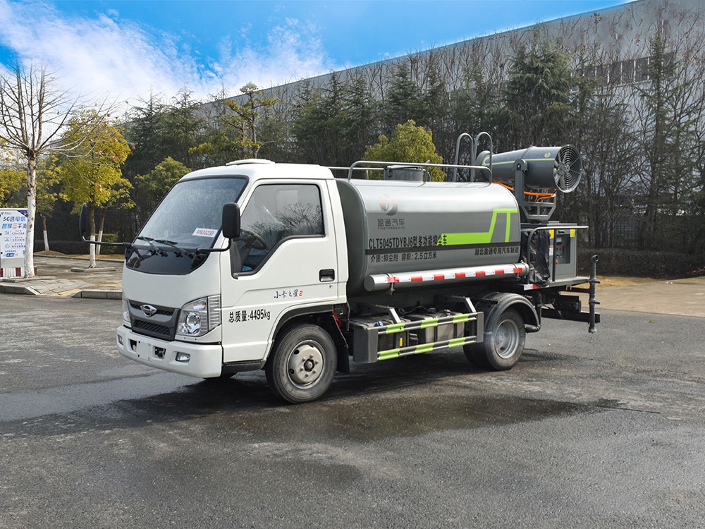 福田小卡 2.7 方抑塵車主要技術參數 序號 名稱 型號、規格 1 整車型號 CLT5045TDYBJ6 型多功能抑塵車 2 發動機型號 Q23-95C60 3 發動機馬力/功率 全柴 95 馬力/70KW 4 發動機排量 2300ML 5 變速箱 蒙沃 5 檔箱 6 輪胎規格 6.00 鋼絲胎 7 軸距 2600 8 總質量 4495KG 9 整備質量 2700KG 10 額定載質量 1665KG 11 整車尺寸(長×寬×高) 5.365*1.9*2.6 12 罐體容積 2.7 方 13 燃料種類 柴油 14 排放標準 國六 15 水泵型號 40/50 16 罐體材質 Q235 碳鋼
