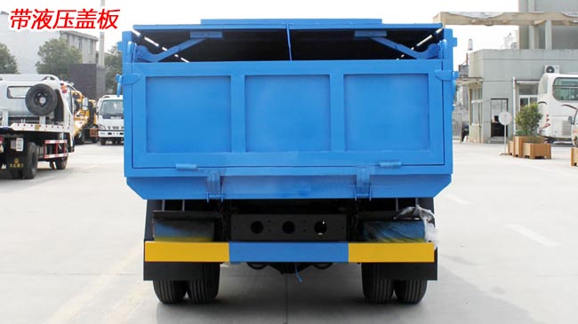 該垃圾車承載5~6噸,自卸式箱體,箱長3.6米,箱寬1.75米,箱高0.8米,采用4毫米厚鋼板制作,箱頂帶液壓蓋板,可向兩邊展開折疊,箱底雙缸液壓自卸,手動尾門。