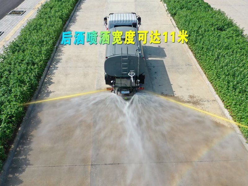 專用功能說明: 用功能配置:罐體實際容積約為14.2立方米,采用武鋼優質碳鋼板卷壓成型。配備專用灑水泵,自吸自排,前噴后灑、側噴、后工作平臺及灑水高壓炮。灑水泵自吸高度為6米左右,整車灑水寬度14米左右,后工作平臺水炮可調成:直沖狀、大雨、中雨、小雨、毛毛雨,有效射程≥28米,整車帶接頭、水位計,自流閥。后工作平臺主管路帶1寸澆花接口,附送2根3米水管,1個爬梯,兩側及后保險杠。