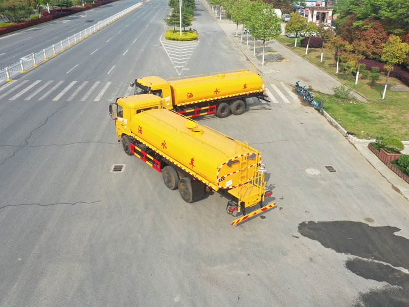 11.00R20鋼絲胎,空調、中控鎖、電動玻璃、氣囊座椅、多功能方向盤、 轉向器及離合器液壓助力,氣壓制動,排氣制動。用功能配置:罐體實際容積約為19立方米,(罐體有效參數15.17立方米、額定載質量14520kg、)采用武鋼優質碳鋼板卷壓成型。配備專用灑水泵,自吸自排,前噴后灑、側噴、后工作平臺及灑水高壓炮。灑水泵自吸高度為6米左右,整車灑水寬度14米左右,后工作平臺水炮可調成:直沖狀、大雨、中雨、小雨、毛毛雨,有效射程≥28米,整車帶接頭、水位計,自流閥。后工作平臺主管路帶1寸澆花接口,附送2根3米水管,1個爬梯,兩側及后保險杠。 19噸東風D3后雙橋灑水車選裝配置: