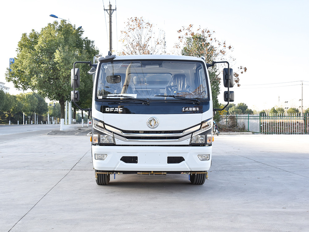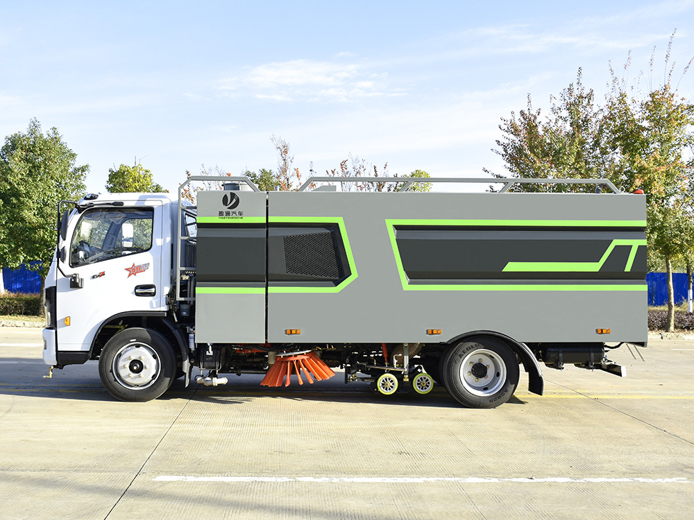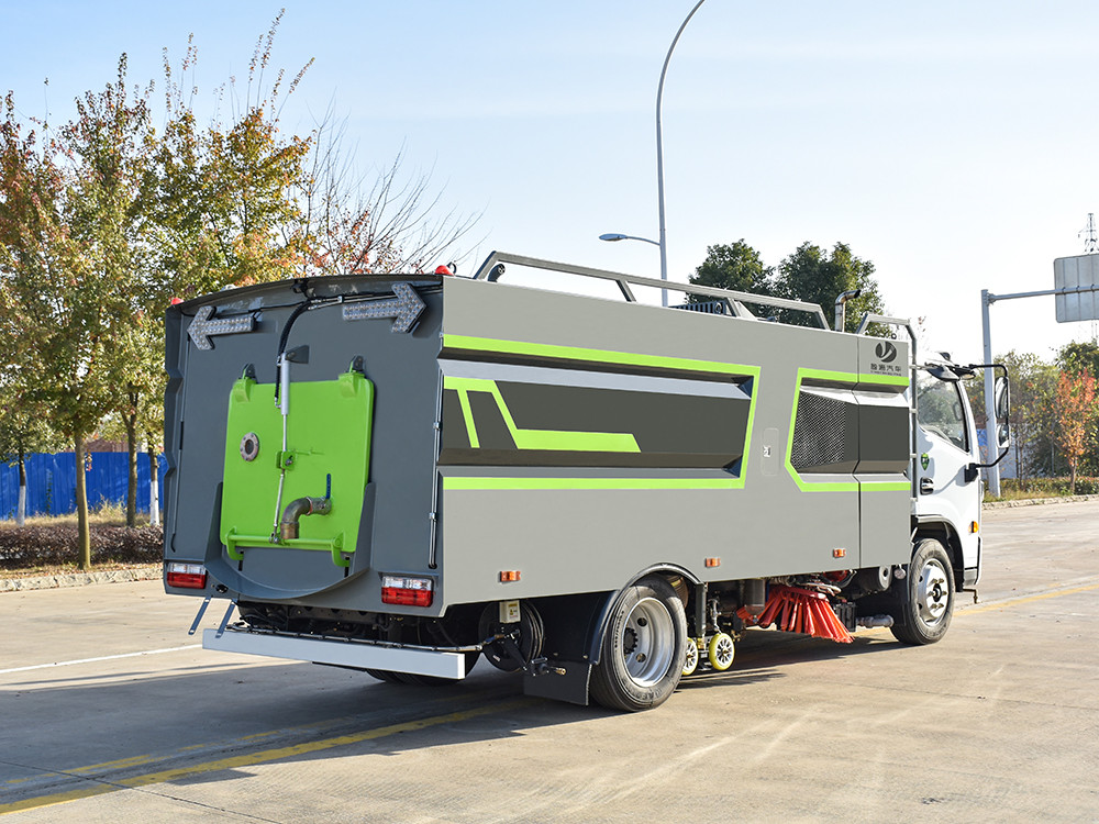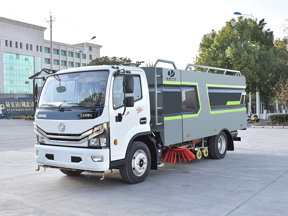 1. 東風多利卡洗掃車采用洗,掃,吸,混合的方式收集垃圾,濕式除塵、電液 PLC 一鍵控制,液壓傾翻卸料的作業方式對路面進行清掃作業。