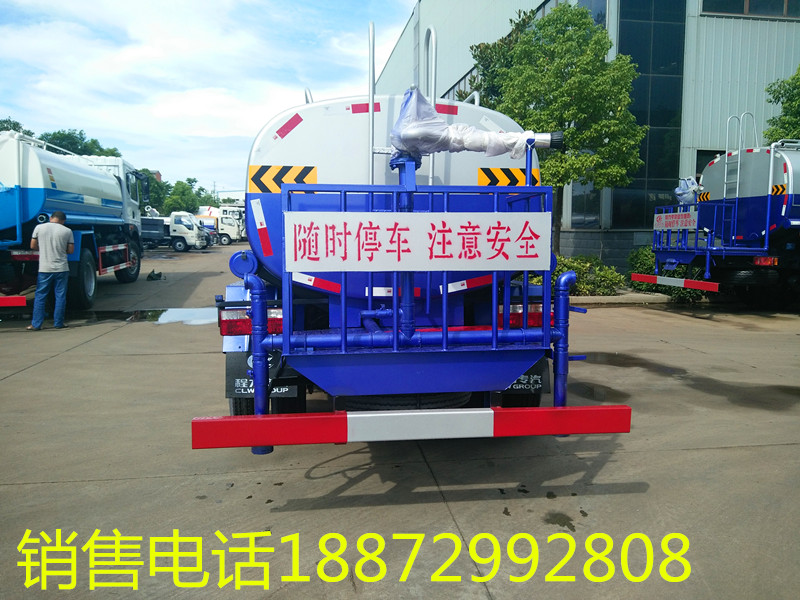 5噸灑水車,隨底盤選裝駕駛室前面罩以及前霧燈。2、灑水車罐體有效容積:4.06立方米,罐體外形尺寸(長×長軸×短軸關系為(mm): 3400×1600×1100, 吸程≧7米,灑水寬度≧14-16米,射程≧25-30米,引水時間<5min,流量60m3/h。前沖(噴)、后灑、帶側噴(花灑)、帶后工作平臺、平臺上安裝綠化灑水高炮(炮噴射形狀可調節:直沖、大雨、中雨、毛毛雨、霧狀、可連續調節,360°旋轉),配消防接口,自流閥,濾網,帶自吸自排功能。配備大功率專用灑水泵,泵可自吸自排,安裝過濾網,帶消防接口,可通過消防栓進水,帶自流閥,隨車選裝20米綠化卷盤,可噴灑農藥,罐體金屬漆。罐體有橢圓和方圓罐兩種,可根據用戶的要求定做 發動機可選,云內,朝柴 ,錫柴,全柴