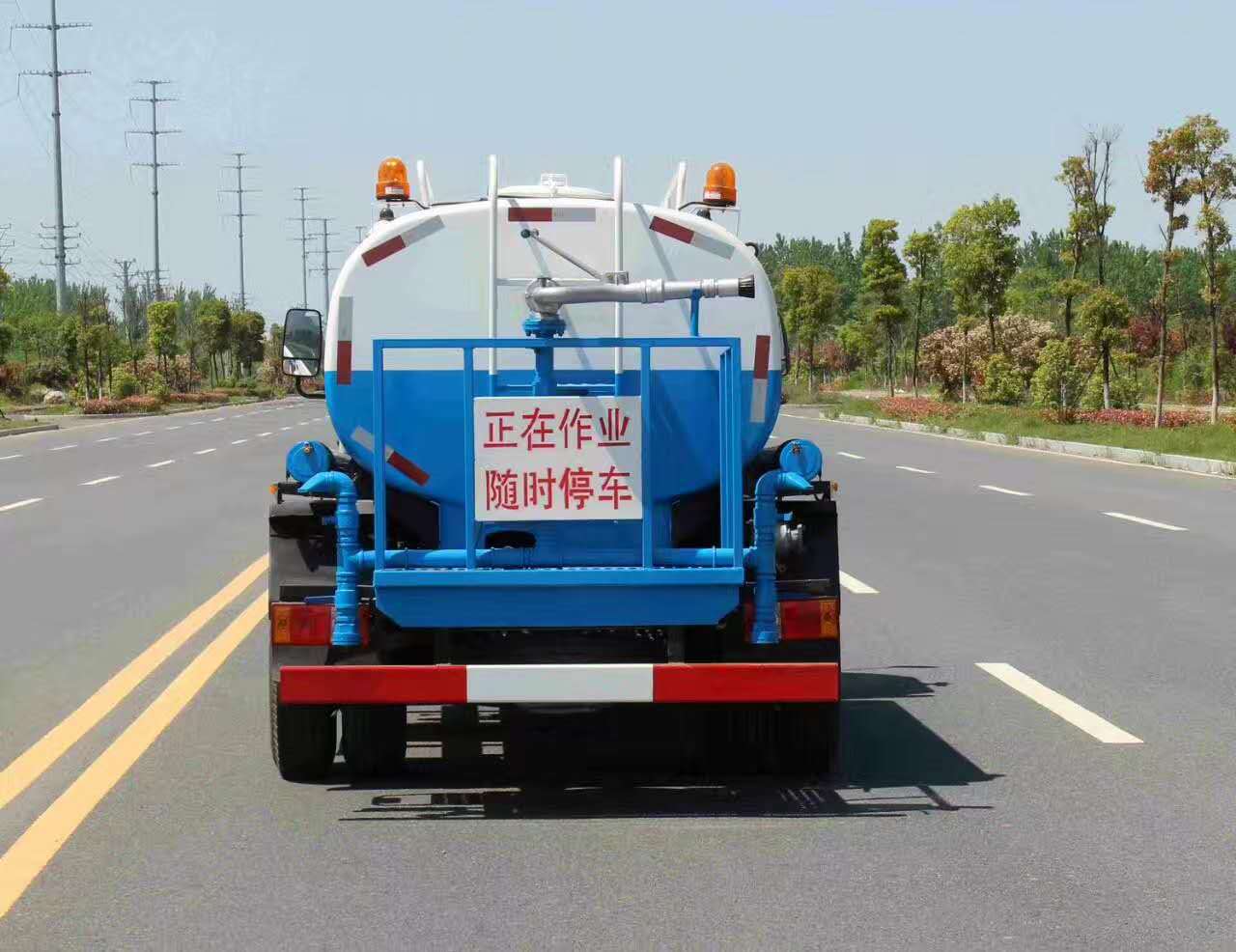改裝配置:罐體用4MM碳鋼板制作,罐內(nèi)隔板具有防波作用,以減低汽車行駛時罐體液體的沖擊。整車帶一個專用灑水泵(垂直最大吸程6米),灑水寬度14米,射程28米。多功能灑水車配備2個前沖(噴)(能將路面泥巴、塵土、垃圾沖干凈);2個后灑(能均勻地將水灑在路面,一次灑水寬度14米)、2個側(cè)噴(花灑)(能均勻地將路旁綠化帶澆灌)、帶1個后工作平臺,平臺上安裝1個綠化灑水高炮(灑水炮可全方位旋轉(zhuǎn),可連續(xù)調(diào)成直沖狀、大雨、小雨、毛毛雨,霧狀可調(diào)節(jié)沖洗高大樹木),引水時間<5min,流量90m3/h。帶1個消防接頭,帶1個自流閥,1個過濾裝置、人性化爬梯及側(cè)防護欄,安裝灑水音樂喇叭。