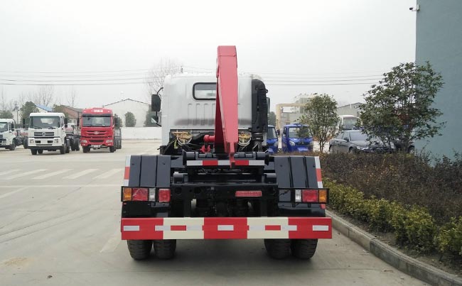 配套5~6立方米勾臂垃圾箱,高強(qiáng)度主勾臂,雙液壓油缸,采用國(guó)產(chǎn)油泵、多路閥、油缸,駕駛室外操作,尾部帶滾輪,箱體鎖緊裝置,鎖緊后可實(shí)現(xiàn)垃圾車(chē)自卸。