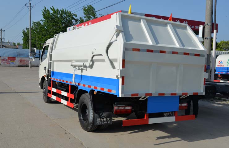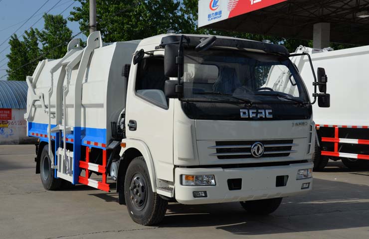 容積6~8立方米,箱體采用Q235碳鋼材質(zhì),箱體右側(cè)配液壓掛桶提升機,可掛國標(biāo)120升+240升塑料垃圾桶,駕駛室外部手動操作,鐵通掛架;后門鎖緊為機械鎖緊,手動開啟;相同結(jié)構(gòu)為槍版形式。