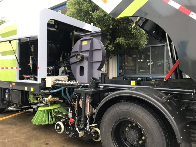 電指示燈熄滅,且無(wú)蜂鳴器響。啟動(dòng)副發(fā)動(dòng)機(jī)怠速運(yùn)轉(zhuǎn) 2-3 分鐘。 b.按左前、右前、后掃吸嘴順序降下前、后掃及吸嘴,然后檢查掃盤接地是否適當(dāng),吸嘴離 地間隙是否正常(5-10mm),如不適合,則進(jìn)行調(diào)整。 c.檢查三通球閥的手柄位置,選擇左掃球閥開閉狀態(tài),打開灑水系統(tǒng)總球閥,將水泵開關(guān)旋 至“工作”位置。 d.檢查各掃盤轉(zhuǎn)動(dòng)是否正常、各噴水口是否有水噴出。 e.確信正常后,操作副發(fā)手油門,使其至 2000-2300r/min,按底盤車要求,駕駛掃路車用一 檔起步,清掃作業(yè)工作中,機(jī)手應(yīng)密切注意各種儀表,確信掃路車工作正常,并觀察清掃效