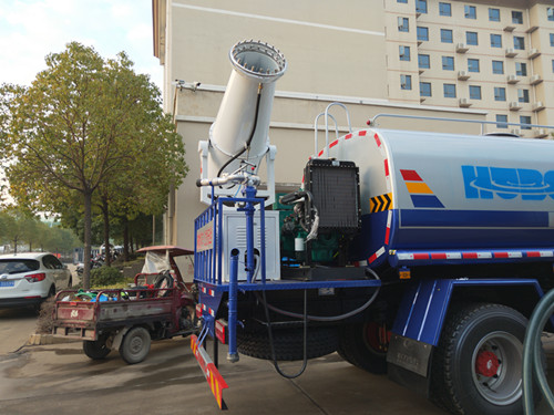 霧炮車,也叫抑塵車,工作效率約為普通灑水車的30倍。水箱中的水經過霧化后,由高壓風機噴出。相比普通灑水車噴出的水流,水霧顆粒極為細小,達到了微米級,其吸附力也增加了3倍,耗水量卻降低了70%,遭遇霧霾天氣、空氣質量PM2.5嚴重超標時,可隨意選定一個區域進行液霧降塵、分解淡化空氣中的顆粒濃度、將飄浮在空氣中的污染顆粒物、塵埃等迅速逼降地面,達到清潔凈化空氣的效果。