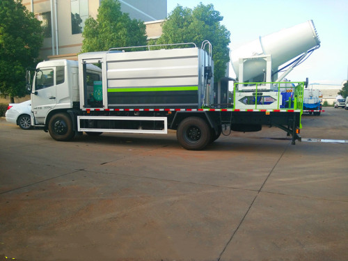 50米多功能抑塵車罐體配置:灑水罐罐體為橢圓形或方圓,材質為武鋼產4mm厚熱板,罐體容積為10-15立方米(可根據用戶要求制作),可載水10-12噸,上戶噸位為6.3噸。罐體采用對接焊工藝制造,進行氣壓檢漏試驗,配備取力器、灑水泵及綠化炮等裝置,帶消防接口,可通過消防栓進水,并帶有工作平臺,具備有前沖、后灑、側噴等灑水功能,同時綠化炮的出水形態可根據需要調節成柱狀、大雨、小雨及霧狀等,可全方位旋轉,其射程可達28米以上。