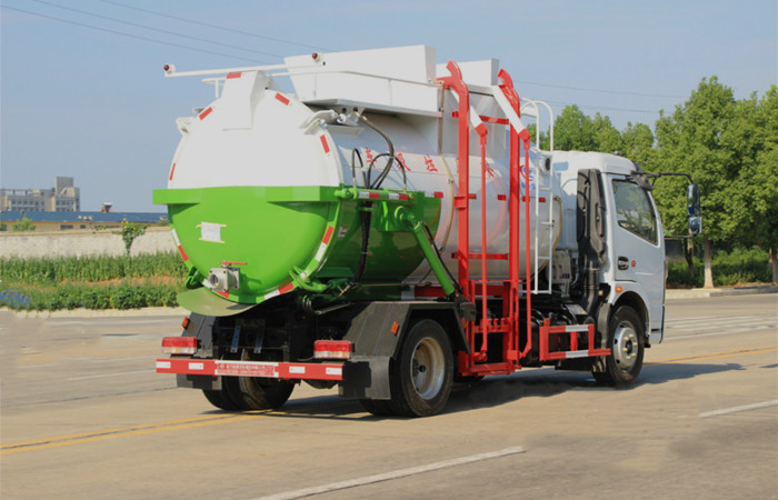★上裝配置:罐體采用 4mm 優(yōu)質(zhì)碳鋼制作,圓形罐體,罐體前后封頭采用圓弧蝶形封頭,配拉桿式提升機,罐體底部配雙缸液壓舉升自卸,罐體尾門液壓打開和鎖緊+手動鎖緊裝置,罐內(nèi)設(shè)固液分離裝置,罐尾設(shè)液體自流閥,液位窗,后門液壓開啟,帶工具箱,洗手裝置。
