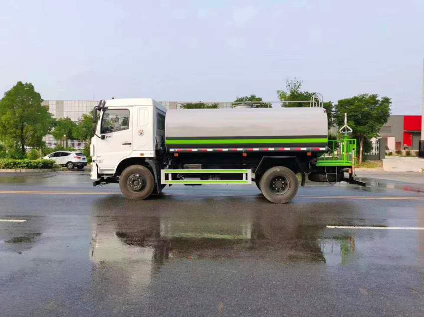4.灑水車前噴頭位置較低,靠近地面,噴灑壓力較大,可用于沖洗路面;后噴頭位置較高(灑水車后噴頭一般左右各安裝一個),灑水面較寬,可用于公路施工灑水,使用后噴頭時,應將前噴管關閉;使用可調噴頭灑水時,灑水寬度可根據需要調整。灑水寬度越寬,中間重疊量越少,灑水密度越均勻。
