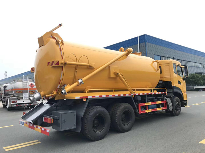 5.液壓舉升自卸功能,便于將各種污物傾倒干凈,后罐門可以液壓啟動開啟,便于清理罐體內的沉積物,凝固物及對罐體內部進行維修、保養,液壓取力增強了系統的穩定性。