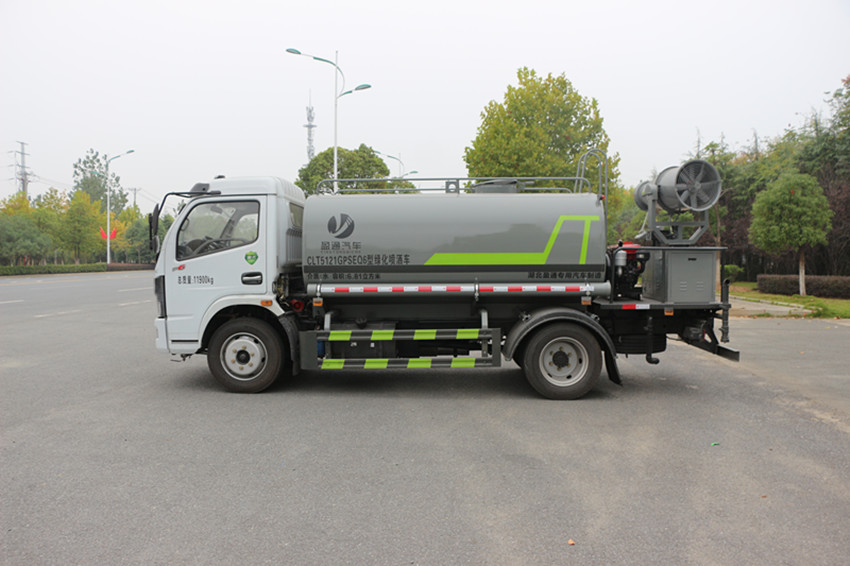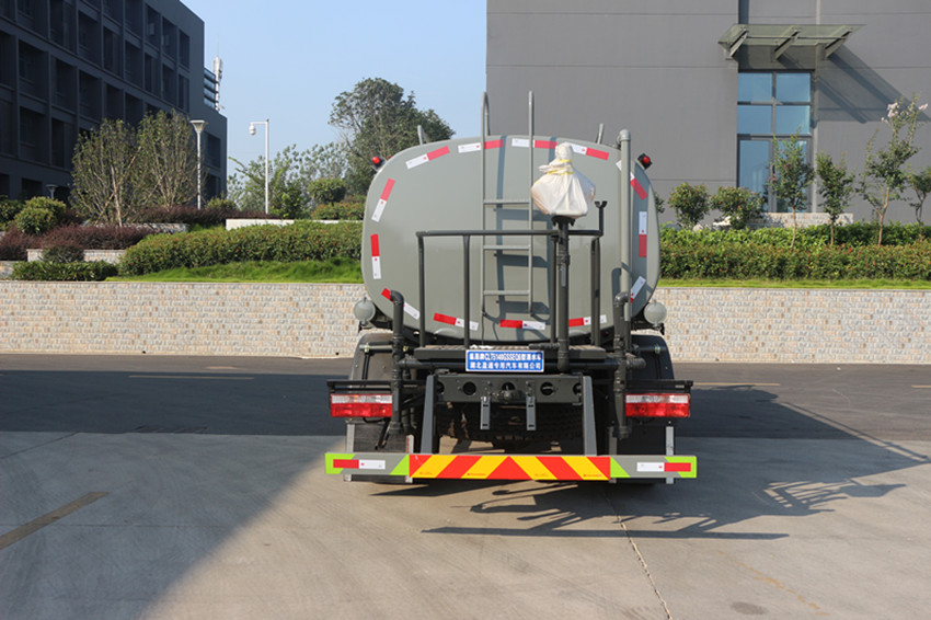 灑水車標配的4項噴灑頭:三彎前沖、后灑、鴨嘴側噴、高壓水炮,每一個噴頭均帶獨立的管道球閥以控制噴頭的開啟與關閉。灑水噴頭開的越多,水流量越大,水的壓力就被分散,道路沖洗效果就會相應降低,這也是有些環衛灑水車只采用一個前沖頭進行道路灑水的原因。另外,灑水車管道內水的壓力越大,水流量自然也會加大。